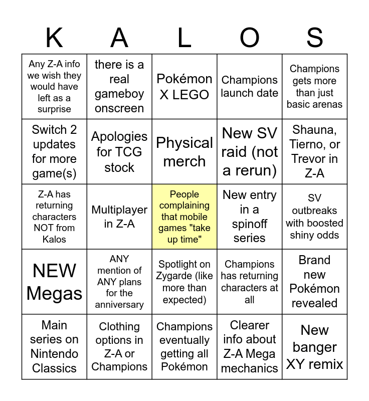 This bingo card has a free space and 24 words: ANY mention of ANY plans for the anniversary, Clothing options in Z-A or Champions, Physical merch, Main series on Nintendo Classics, Champions gets more than just basic arenas, Any Z-A info we wish they would have left as a surprise, Switch 2 updates for more game(s), there is a real gameboy onscreen, New entry in a spinoff series, Spotlight on Zygarde (like more than expected), New SV raid (not a rerun), Z-A has returning characters NOT from Kalos, Champions has returning characters at all, Brand new Pokémon revealed, Apologies for TCG stock, Clearer info about Z-A Mega mechanics, SV outbreaks with boosted shiny odds, Pokémon X LEGO, Shauna, Tierno, or Trevor in Z-A, Multiplayer in Z-A, New banger XY remix, NEW Megas, Champions launch date and Champions eventually getting all Pokémon.