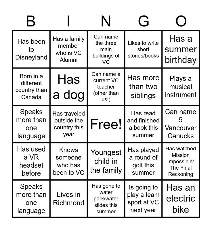 This bingo card has a free space and 24 words: Knows someone who has been to VC, Lives in Richmond, Can name a current VC teacher (other than us!), Speaks more than one language, Has a summer birthday, Has been to Disneyland, Born in a different country than Canada, Has a family member who is VC Alumni, Has read and finished a book this summer, Youngest child in the family, Has more than two siblings, Speaks more than one language, Has played a round of golf this summer, Has watched Mission Impossible: The Final Reckoning, Has a dog, Is going to play a team sport at VC next year, Can name 5 Vancouver Canucks, Can name the three main buildings of VC, Plays a musical instrument, Has traveled outside the country this year, Has an electric bike, Has used a VR headset before, Likes to write short stories/books and Has gone to water park/water slides this summer.