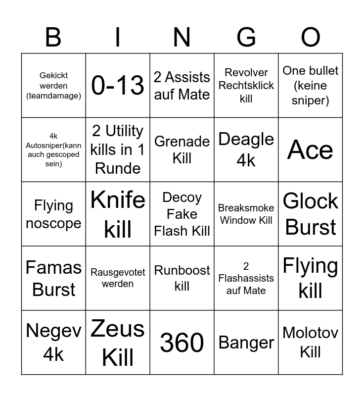 This bingo card has a free space and 24 words: Rausgevotet werden, Zeus Kill, Grenade Kill, Negev 4k, One bullet (keine sniper), Gekickt werden (teamdamage), 4k Autosniper(kann auch gescoped sein), 0-13, Breaksmoke Window Kill, Runboost kill, Deagle 4k, Flying noscope, 2 Flashassists auf Mate, Flying kill, 2 Utility kills in 1 Runde, Banger, Glock Burst, 2 Assists auf Mate, Ace, Knife kill, Molotov Kill, Famas Burst, Revolver Rechtsklick kill and 360.
