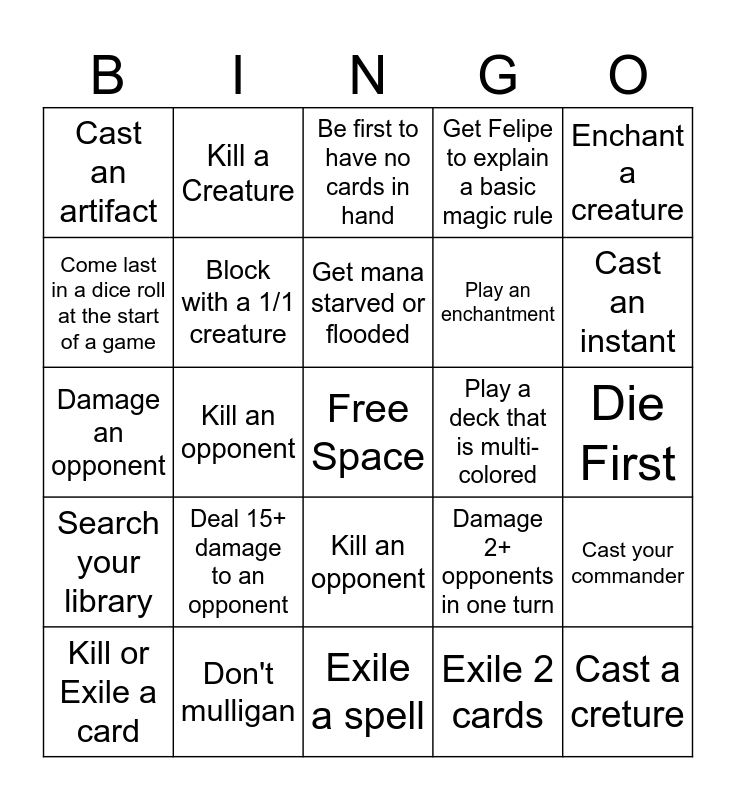 This bingo card has a free space and 24 words: Deal 15+ damage to an opponent, Don't mulligan, Get mana starved or flooded, Kill or Exile a card, Enchant a creature, Cast an artifact, Come last in a dice roll at the start of a game, Kill a Creature, Play a deck that is multi-colored, Kill an opponent, Play an enchantment, Damage an opponent, Damage 2+ opponents in one turn, Cast your commander, Block with a 1/1 creature, Exile 2 cards, Die First, Be first to have no cards in hand, Cast an instant, Kill an opponent, Cast a creture, Search your library, Get Felipe to explain a basic magic rule and Exile a spell.