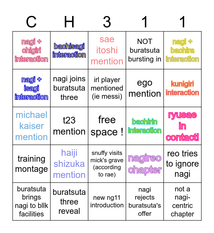 This bingo card has a free space and 24 words: haiji shizuka mention, buratsuta three reveal, irl player mentioned (ie messi), buratsuta brings nagi to bllk facilities, nagi + bachira interaction, nagi + chigiri interaction, nagi + isagi interaction, bachisagi interaction, bachirin interaction, snuffy visits mick's grave (according to rae), ego mention, michael kaiser mention, nagireo chapter, reo tries to ignore nagi, nagi joins buratsuta three, nagi rejects buratsuta's offer, ryusae in contact!, sae itoshi mention, kunigiri interaction, t23 mention, not a nagi-centric chapter, training montage, NOT buratsuta bursting in and new ng11 introduction.