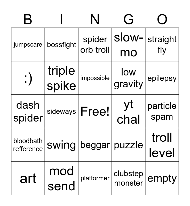 This bingo card has a free space and 24 words: swing, mod send, impossible, art, straight fly, jumpscare, :), bossfight, yt chal, beggar, low gravity, dash spider, puzzle, troll level, triple spike, clubstep monster, particle spam, spider orb troll, epilepsy, sideways, empty, bloodbath refference, slow-mo and platformer.