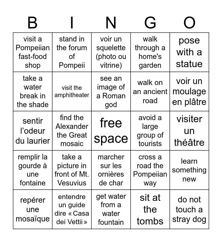 This bingo card has a free space and 48 words: visit a Roman bath, do not touch a stray dog, see the plaster casts, get water from a water fountain, take a picture in front of Mt. Vesuvius, see a mosaic, stand in the forum of Pompeii, visit a theather, take a water break in the shade, find the Cave Canem mosaic, visit the amphitheater, walk through a home's garden, learn something new, cross a road the Pompeiian way, walk through a temple, prevent sunburn, see an image of a Roman god, avoid a large group of tourists, see a fresco painting, pose with a statue, find the Alexander the Great mosaic, sit at the tombs, visit a Pompeiian fast-food shop, walk on an ancient road, croiser le chien « Cave Canem », voir un moulage en plâtre, repérer une mosaïque, traverser le forum, marcher sur les ornières de char, remplir la gourde à une fontaine, apercevoir le Vésuve, voir un thermopolium, compter 3 colonnes intactes, photographier une fresque, entendre un guide dire « Casa dei Vettii », faire coucou à un chat antique, trouver un graffiti, visiter un théâtre, toucher (des yeux) l’amphithéâtre, repérer un four à pain, entendre « c’est trop chaud ! », passer sous une arche, voir un squelette (photo ou vitrine), trouver un évier romain, sentir l’odeur du laurier, voir un triglyph (décor de temple), croiser un groupe scolaire and FREE SPACE (pause gelato).