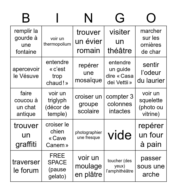 This bingo card has 25 words: croiser le chien « Cave Canem », voir un moulage en plâtre, repérer une mosaïque, traverser le forum, marcher sur les ornières de char, remplir la gourde à une fontaine, apercevoir le Vésuve, voir un thermopolium, compter 3 colonnes intactes, photographier une fresque, entendre un guide dire « Casa dei Vettii », faire coucou à un chat antique, vide, repérer un four à pain, entendre « c’est trop chaud ! », passer sous une arche, voir un squelette (photo ou vitrine), trouver un évier romain, sentir l’odeur du laurier, voir un triglyph (décor de temple), croiser un groupe scolaire, FREE SPACE (pause gelato), trouver un graffiti, visiter un théâtre and toucher (des yeux) l’amphithéâtre.