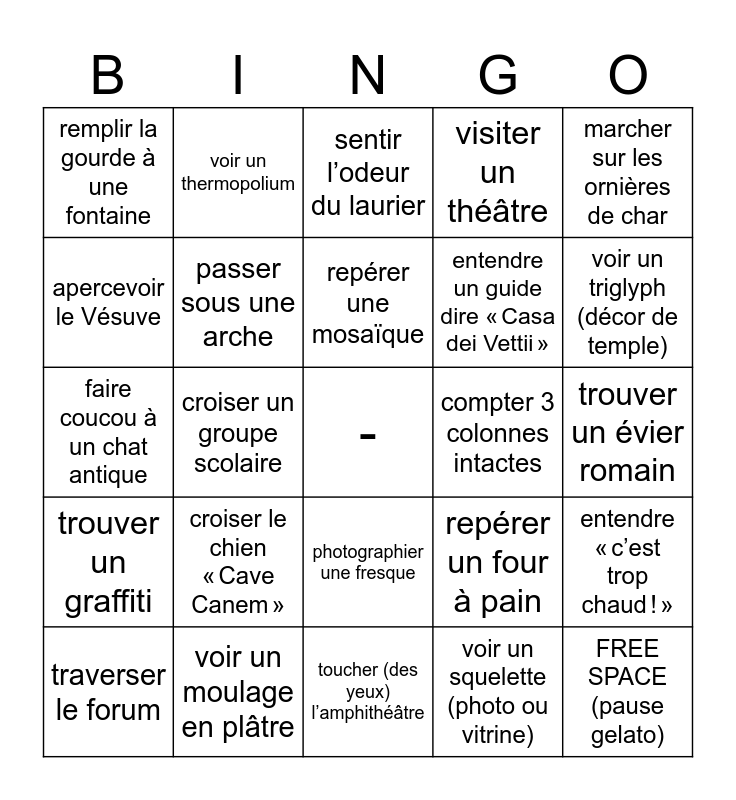 This bingo card has a free space and 24 words: croiser le chien « Cave Canem », voir un moulage en plâtre, repérer une mosaïque, traverser le forum, marcher sur les ornières de char, remplir la gourde à une fontaine, apercevoir le Vésuve, voir un thermopolium, compter 3 colonnes intactes, photographier une fresque, entendre un guide dire « Casa dei Vettii », faire coucou à un chat antique, repérer un four à pain, entendre « c’est trop chaud ! », passer sous une arche, voir un squelette (photo ou vitrine), trouver un évier romain, sentir l’odeur du laurier, voir un triglyph (décor de temple), croiser un groupe scolaire, FREE SPACE (pause gelato), trouver un graffiti, visiter un théâtre and toucher (des yeux) l’amphithéâtre.