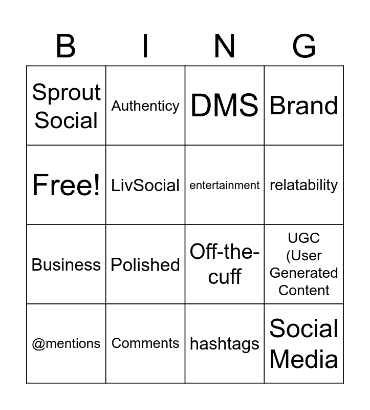 This bingo card has 16 words: Comments, UGC (User Generated Content, DMS, Sprout Social, Business, Authenticy, Off-the- cuff, hashtags, Free!, LivSocial, @mentions, Brand, Polished, relatability, entertainment and Social Media.