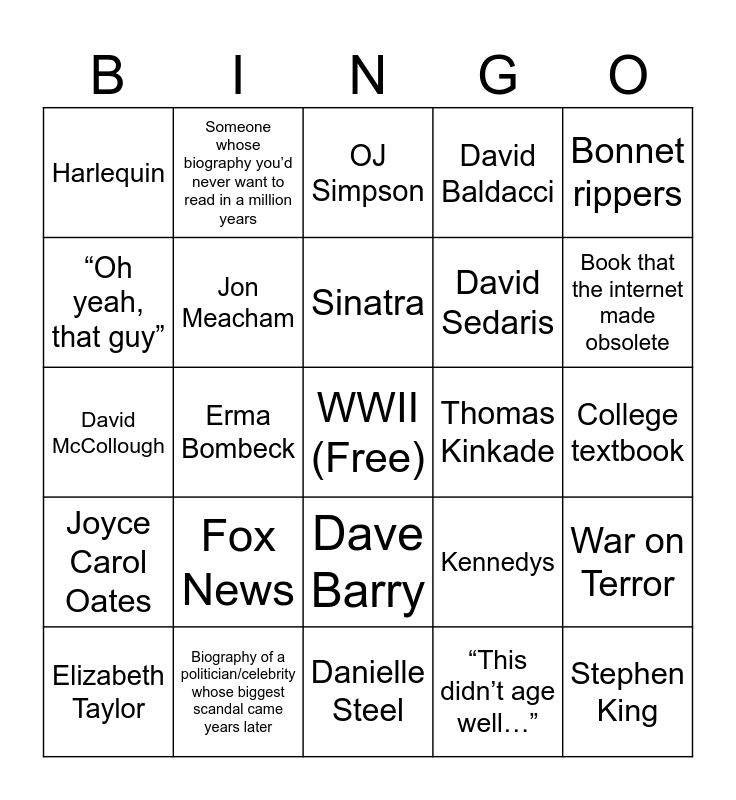 This bingo card has a free space and 24 words: Fox News, Biography of a politician/celebrity whose biggest scandal came years later, Sinatra, Elizabeth Taylor, Bonnet rippers, Harlequin, “Oh yeah, that guy”, Someone whose biography you’d never want to read in a million years, Thomas Kinkade, Dave Barry, David Sedaris, David McCollough, Kennedys, War on Terror, Jon Meacham, “This didn’t age well…”, College textbook, OJ Simpson, Book that the internet made obsolete, Erma Bombeck, Stephen King, Joyce Carol Oates, David Baldacci and Danielle Steel.