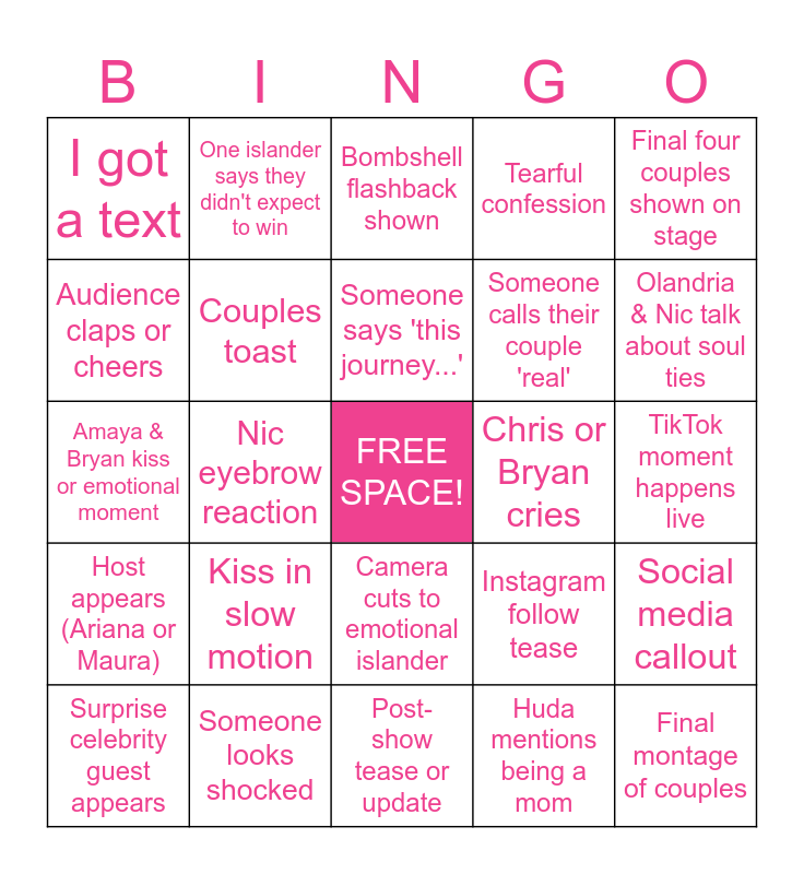 This bingo card has a free space and 25 words: Kiss in slow motion, Post-show tease or update, Someone says 'this journey...', Surprise celebrity guest appears, Final four couples shown on stage, I got a text, Audience claps or cheers, One islander says they didn't expect to win, Chris or Bryan cries, Camera cuts to emotional islander, Someone calls their couple 'real', Amaya & Bryan kiss or emotional moment, Instagram follow tease, Social media callout, Couples toast, Fans online are screaming, TikTok moment happens live, Bombshell flashback shown, Olandria & Nic talk about soul ties, Nic eyebrow reaction, Final montage of couples, Someone looks shocked, Host appears (Ariana or Maura), Tearful confession and Huda mentions being a mom.
