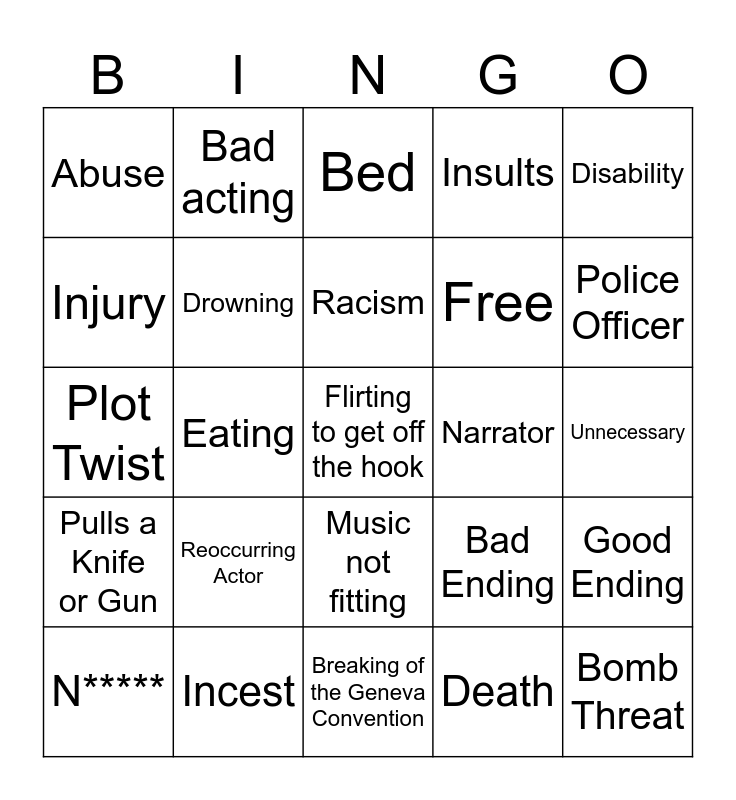 This bingo card has a free space and 24 words: Reoccurring Actor, Incest, Racism, N*****, Disability, Abuse, Injury, Bad acting, Narrator, Music not fitting, Free, Plot Twist, Bad Ending, Good Ending, Drowning, Death, Unnecessary, Bed, Police Officer, Eating, Bomb Threat, Pulls a Knife or Gun, Insults and Breaking of the Geneva Convention.