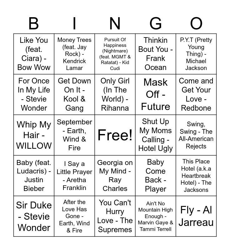 This bingo card has a free space and 101 words: Down Under - Men At Work, Dancing in the Moonlight - King Harvest, P.Y.T (Pretty Young Thing) - Michael Jackson, Never Too Much - Luther Vandross, Candy - Cameo, She's A Bad Mama Jama (She's Built, She's Stacked) - Carl Carlton, I Keep Forgettin' (Every Time You're Near) - Micheal McDonald, Lotus Flower Bomb (feat. Miguel) - Wale, At Last - Etta James, (Sittin' On) the Dock of the Bay - Otis Redding, Sara Smile - Daryl Hall & John Oates, Stand By Me - Ben E. King, Sunny - Bobby Hebb, Build Me Up Buttercup - The Foundation, Overnight Celebrity - Twista, Novacane - Frank Ocean, Baby (feat. Ludacris) - Justin Bieber, Careless Whisper - George Michael, Superstition - Stevie Wonder, Super Freak - Rick James, My Girl - The Temptations, Africa - Toto, Return of the Mack - Mark Morrison, I Luv Your Girl - The Dream, Sweet Dreams (Are Made of This) - Eurythmics, Come and Get Your Love - Redbone, Thinkin Bout You - Frank Ocean, I Say a Little Prayer - Aretha Franklin, Strawberry Letter 23 - The Brothers Johnson, Don't Stop The Music - Yarbrough & Peoples, Money Trees (feat. Jay Rock) - Kendrick Lamar, Pursuit Of Happiness (Nightmare) (feat. MGMT & Ratatat) - Kid Cudi, Int'l Players Anthem (I Choose You) (feat. Outkast) - UGK (Underground Kingz), Promiscuous (feat. Timbaland) - Nelly Furtado, Confident (feat. Chance The Rapper) - Justin Bieber, Georgia on My Mind - Ray Charles, I Want You Back - Jackson 5, Please Mr. Postman - The Marvelettes, Ain't No Mountain High Enough - Marvin Gaye & Tammi Terrell, You Can't Hurry Love - The Supremes, Ain't No Sunshine - Bill Withers, Sir Duke - Stevie Wonder, Thinkin' About It Too - Al Jarreau, I Do - Al Jarreau, Brite N' Sunny Babe - Al Jarreau, Fly - Al Jarreau, Heaven Sent - Keyshia Cole, V.S.O.P - K. Michelle, ABC - Jackson 5, I Heard It Through The Grapevine - Marvin Gaye, Everybody Plays the Fool - The Main Ingredient, For Once In My Life - Stevie Wonder, Try A Little Tenderness - Otis Redding, Treat Her Like A Lady - The Temptations, I'll Be Good To You - The Brothers Johnson, That's What I Like - Bruno Mars, Rock With You - Michael Jackson, I Like It - DeBarge, Every Breath You Take - The Police, Outstanding - The Gap Band, Get Down On It - Kool & Gang, I Wanna Be Your Lover - Prince, Don't Disturb This Groove - The System, Hit the Road Jack - Ray Charles, No Idea - Don Toliver, Mask Off - Future, Let's Groove - Earth, Wind & Fire, September - Earth, Wind & Fire, After the Love Has Gone - Earth, Wind & Fire, Motownphilly - Boyz II Men, Whatever You Want - Tony! Toni! Tone!, Grass Ain't Greener - Chris Brown, Like You (feat. Ciara) - Bow Wow, Kiss Kiss (feat. T-Pain) - Chris Brown, Only Girl (In The World) - Rihanna, Whip My Hair - WILLOW, Brick House - Commodores, Snooze - SZA, Like I Want You - Giveon, See You Again (feat. Kali Uchis) - Tyler The Creator, MILLION DOLLAR BABY - Tommy Richman, Viva la Vida - Coldplay, Shut Up My Moms Calling - Hotel Ugly, Holding On (When Love is Gone) - LTD, That's What You Get - Paramore, Check Yes, Juliet - We The Kings, Swing, Swing - The All-American Rejects, Ain’t It Fun - Paramore, Kill Bill - SZA, Remember The Time - Michael Jackson, Baby Come Back - Player, He’s the Greatest Dancer - Sister Sledge, I’m Every Woman - Chaka Khan, Just the Two of Us (feat. Bill Withers) - Grover Washington, Jr., Sure Thing - Miguel, This Place Hotel (a.k.a Heartbreak Hotel) - The Jacksons, Old Town Road - Lil Nas X, New Flame (feat. Usher & Rick Ross) - Chris Brown, What About Your Friends - TLC, Hug Me - Pharrell Williams & Trey Parker and Everlasting Love - Carl Carlton.