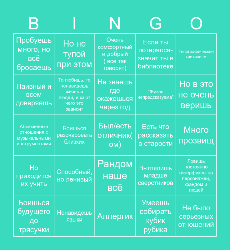 This bingo card has 25 words: Способный, но ленивый, Аллергик, Не знаешь где окажешься через год, Боишься будущего до трясучки, Типографический критинизм, Пробуешь много, но всё бросаешь, Наивный и всем доверяешь, Но не тупой при этом, Есть что рассказать в старости, Рандом наше всё, "Жизнь непредсказуема", Абьюзивные отношения с музыкальными инструментами, Выглядишь младше сверстников, Ловишь постоянно гиперфиксы на персонажей, фандом и людей, То любишь, то ненавидешь жизнь и людей, и хз от чего это зависит, Не было серьезных отношений, Много прозвищ, Очень комфортный и добрый ( все так говорят), Но в это не очень веришь, Боишься разочаровать близких, Был/есть отличник( ом), Ненавидешь языки, Но приходится их учить, Если ты потерялся-значит ты в библиотеке and Умеешь собирать кубик рубика.