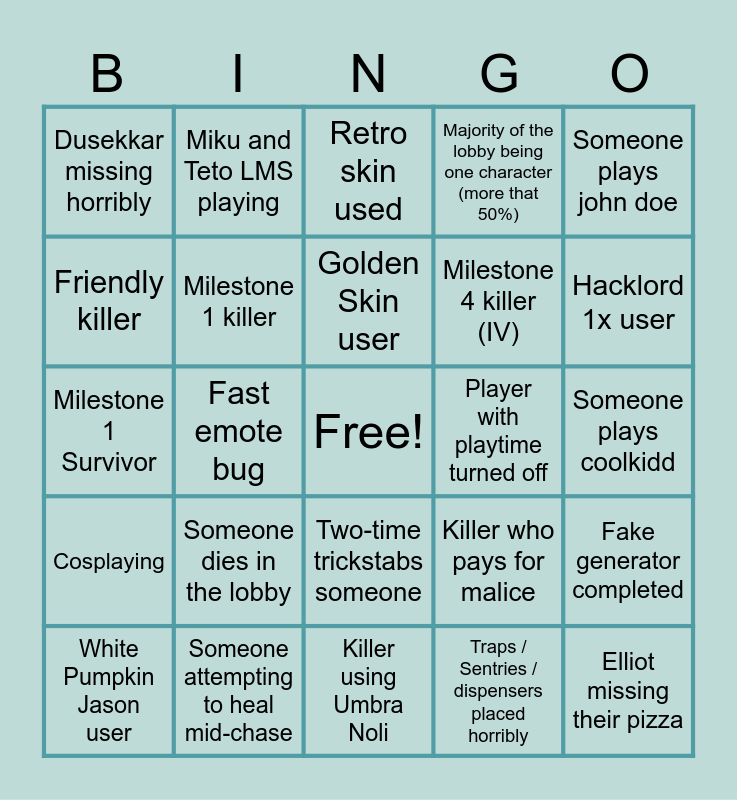 This bingo card has a free space and 64 words: Killer Called a targeter, Afk Killer, Afk survivor, Fake generator completed, 1x and shed LMS playing, c00lkidd and 007n7 LMS playing, Miku and Teto LMS playing, Just Shapes & Beats LMS Playing, Golden Skin user, New player absolutely decimated by lobby, Two-time trickstabs someone, Shed missing their slash, Someone plays coolkidd, Someone plays john doe, Killer using "yourself" skin, Friendly killer, Fast emote bug, Dusekkar missing horribly, Supports / healers targeted first, Milestone 4 killer (IV), Someone dies in the lobby, Cosplaying, Majority of the lobby being one character (more that 50%), Someone having 20+ malice, "ez" or anything else making fun of the killer, killer resetting / leaving right when they become killer, Use of the "Who Wins" or "Locked" emote, 4+ Players using the same emote at once, 007n7 roleplayer, Guest's block being baited, accidentally using an ability, Player using vc, someone using the laughing emote, 3 players on a gen at once, Hacklord 1x user, White Pumpkin Jason user, Someone having their malice turned off, Traps / Sentries / dispensers placed horribly, Milestone 4 Survivor, Milestone 1 killer, Milestone 1 Survivor, Player with playtime turned off, Player with survivor wins turned off, Player with killer wins turned off, Cosplayer not cosplaying the character they are using, Elliot missing their pizza, Someone attempting to heal mid-chase, Person having a year in their username, Killer who pays for malice, Noob making it to LMS, Player accused of being p2w, Killer using Mafioso c00lkidd, Killer using Umbra Noli, Killer using Gasharpoon, Sorcerer Guest, Cosplay Noob, Retro skin used, Flipnote Chance, 5 More Sheds user, Gummy Elliot, Barber Jason and Bald two-time LMS, Combat Initiation Jason, Someone attempting to stun a killer during stun invincibility and Someone using California Girls.