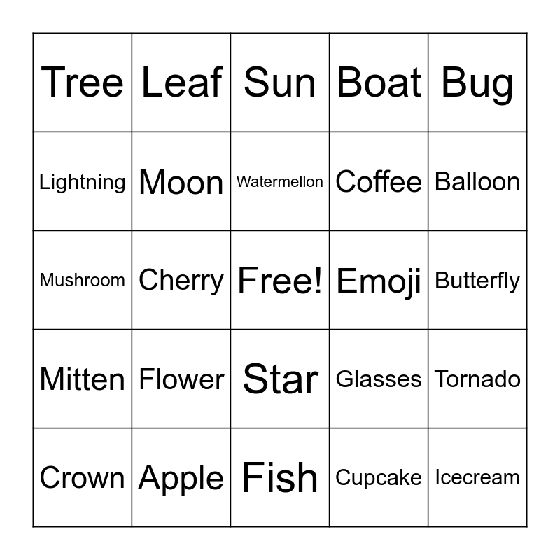 This bingo card has a free space and 30 words: Apple, Banana, Cherry, House, Tree, Sun, Moon, Star, Emoji, Fish, Butterfly, Icecream, Cupcake, Lollipop, Balloon, Cloud, Glasses, Mitten, Flower, Bug, Mushroom, Heart, Leaf, Coffee, Lightning, Boat, Tornado, Crown, Watermellon and Candle.
