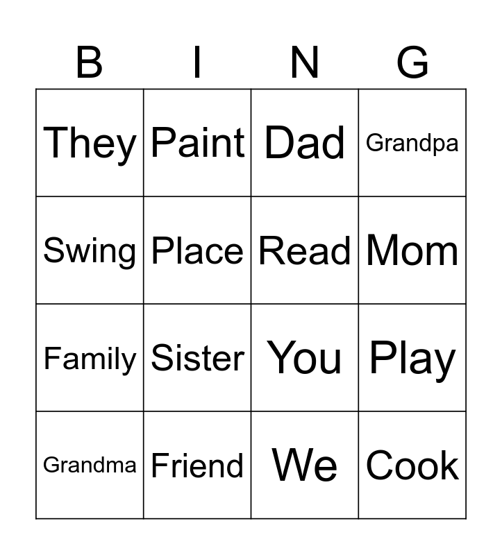 This bingo card has 33 words: Free!, Fun, Play, Laugh, Cook, Read, Swing, Talk, Paint, Walk, Mom, Dad, Uncle, Aunt, Friend, Sister, Brother, You, I, He, She, It, They, We, Cousins, Grandma, Grandpa, Family, Place, Thing, Idea, Animal and People.