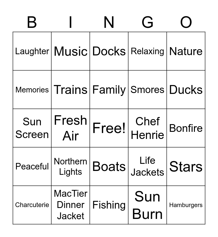 This bingo card has a free space and 66 words: BBQ, Sunset, Cocktails, Stars, Loon, Swim, Music, Games, Family, Friends, Boats, Water Sports, Bonfire, Nature, FUN, Memories, Fresh Air, Laughter, Movies, Smores, Northern Lights, Peaceful, Relaxing, Suntanning, Towel, Flip Flops, Mosquitos, Ice Cream, Hamburgers, Bathing Suits, Charcuterie, Sun, Sand, Floats, Life Jackets, MacTier Dinner Jacket, Bees, Sun Screen, Sun Burn, Foodland, Trains, Snowmobiling, Chef Henrie, Toasting Marshmallows, Flowers, Birds, Ducks, Stories, Kayak, Paddle Boat, SUP Board, Cards, Fireworks, Canoe, Tiki Bar, Photos, Muskoka, Canada Geese, Docks, Fishing, Big Dipper, Aurora Borealis, Beer, Popcorn, Chips and Chipmunks.