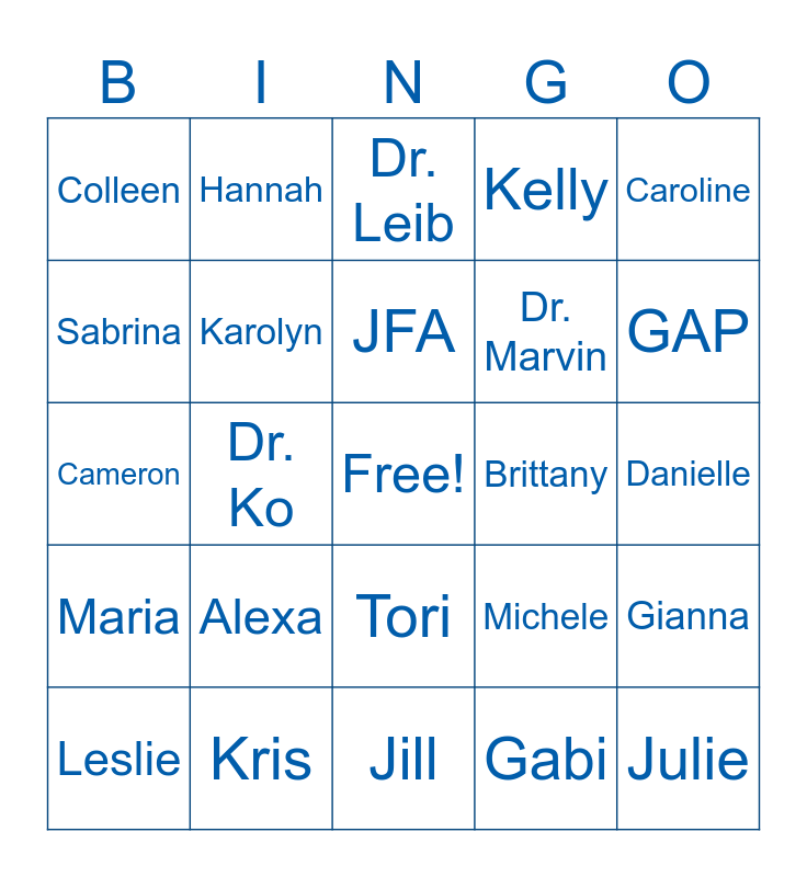 This bingo card has a free space and 30 words: Kris, Cindy, Dr. Ko, Dawn, Colleen, Dr. Leib, Karolyn, Tori, Brittany, Jill, Danielle, Julie, Gabi, Margaret, GAP, Nancy, Michele, Maria, Alexa, Caroline, Cameron, Allyson, Hannah, Dr. Marvin, Sabrina, Kelly, Gianna, Leslie, JFA and Khalidah.