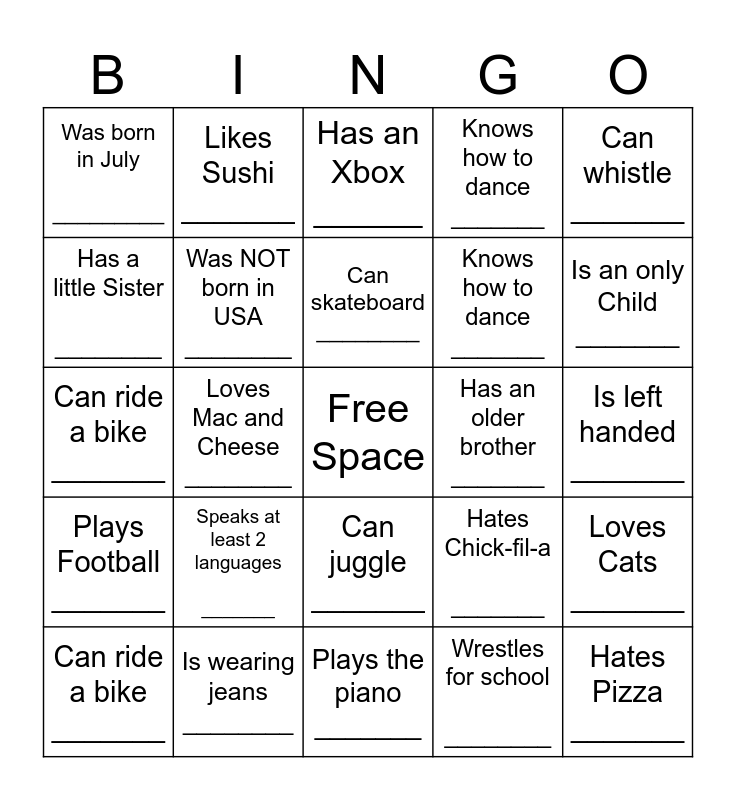 This bingo card has a free space and 32 words: Has a nickname _______, Is wearing jeans ________, Plays the piano _______, Has a Dog _______, Is an only Child _______, Was born in July _________, Loves Mac and Cheese ________, Can juggle _______, Knows how to dance _______, Hates Pizza _______, Has a little Sister ________, Likes Sushi _______, Wrestles for school ________, Can whistle _______, Plays Football _______, Was NOT born in MN ________, Was born in March __________, Has an older brother _______, Is left handed _______, Can ride a bike _______, Speaks at least 2 languages _______, Plays soccer _______, Hates Chick-fil-a _______, Loves Cats _______, Can ride a bike _______, Was NOT born in USA ________, Has an Xbox ______, Knows how to dance _______, Can whistle _______, Enjoys Camping _______, Has a nickname _______ and Can skateboard ________.