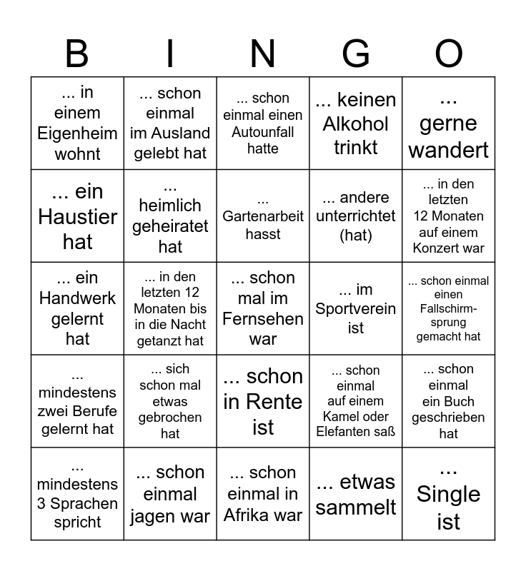 This bingo card has 25 words: ... sich schon mal etwas gebrochen hat, ... schon einmal in Afrika war, ... Gartenarbeit hasst, ... mindestens 3 Sprachen spricht, ... gerne wandert, ... in einem Eigenheim wohnt, ... ein Haustier hat, ... schon einmal im Ausland gelebt hat, ... im Sportverein ist, ... schon in Rente ist, ... andere unterrichtet (hat), ... ein Handwerk gelernt hat, ... schon einmal auf einem Kamel oder Elefanten saß, ... schon einmal ein Buch geschrieben hat, ... heimlich geheiratet hat, ... Single ist, ... schon einmal einen Fallschirm-sprung gemacht hat, ... schon einmal einen Autounfall hatte, ... in den letzten 12 Monaten auf einem Konzert war, ... in den letzten 12 Monaten bis in die Nacht getanzt hat, ... schon mal im Fernsehen war, ... schon einmal jagen war, ... mindestens zwei Berufe gelernt hat, ... keinen Alkohol trinkt and ... etwas sammelt.