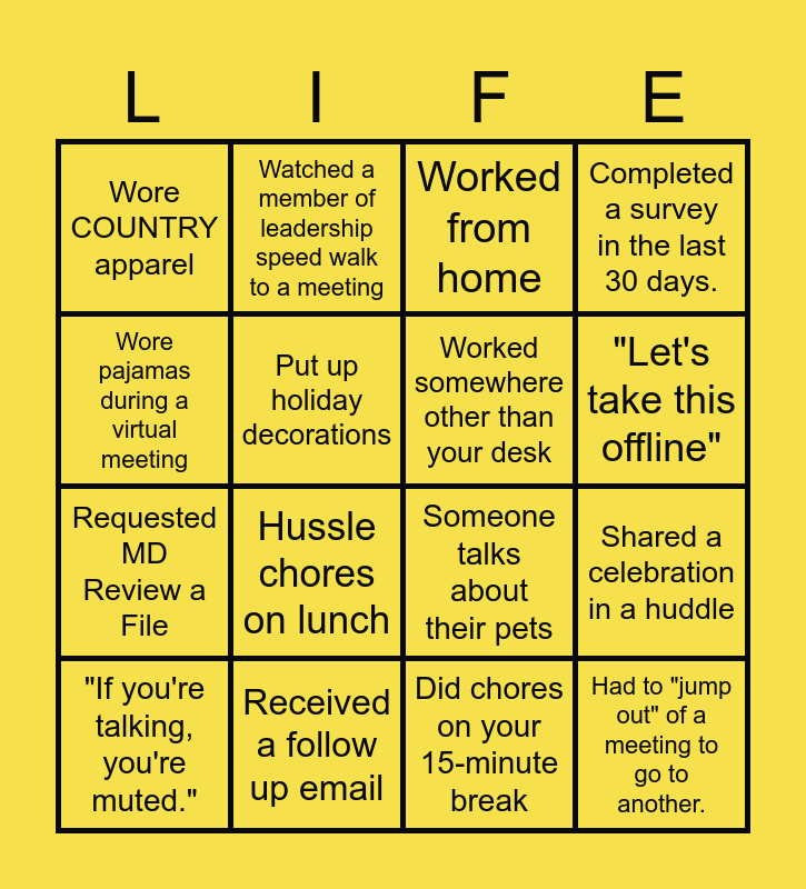 This bingo card has 44 words: Drank a glass of water, "If you're talking, you're muted.", Responded to an IM with a GIF, Someone responded to your IM with a GIF, Presenter not sharing their screen, Ate during a meeting, Worked from home, Got up and took a stretch, Wore pajamas during a virtual meeting, Read this month's Fun Committee newsletter, Completed a survey in the last 30 days., Received a follow up email, Ran an errand on your lunch, Typed your password incorrectly, Spotted pet/kids in the background of a virtual meeting, Had to make a second cup of coffee, Had to reset a password, Someone talks about their pets, Took a lunch, Hussle chores on lunch, Watched a member of leadership speed walk to a meeting, Filled out your timecard, Submitted an IT ticket, Wore COUNTRY apparel, Called an agent and got a voicemail, Did chores on your 15-minute break, Sent an email to another department, Took a 15-minute break, "Can everyone see my screen?", Had to "jump out" of a meeting to go to another., Listened to a podcast while working, Got "time back to your day" from a meeting ending early., Updated your production calendar, Had a 1:1 with your supervisor, Shared a celebration in a huddle, Scheduled a meeting, Updated your timecard, Submitted an idea on the idea tracker in the last 30 days, "Let's take this offline", Put up holiday decorations, Requested MD Review a File, Had your camera on during a meeting, Worked somewhere other than your desk and Received a GIF/MEME as a response.