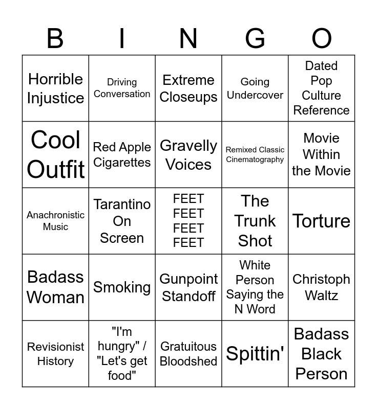 This bingo card has a free space and 24 words: Smoking, "I'm hungry" / "Let's get food", Gravelly Voices, Revisionist History, Dated Pop Culture Reference, Horrible Injustice, Cool Outfit, Driving Conversation, The Trunk Shot, Gunpoint Standoff, Remixed Classic Cinematography, Anachronistic Music, White Person Saying the N Word, Christoph Waltz, Red Apple Cigarettes, Spittin', Torture, Extreme Closeups, Movie Within the Movie, Tarantino On Screen, Badass Black Person, Badass Woman, Going Undercover and Gratuitous Bloodshed.