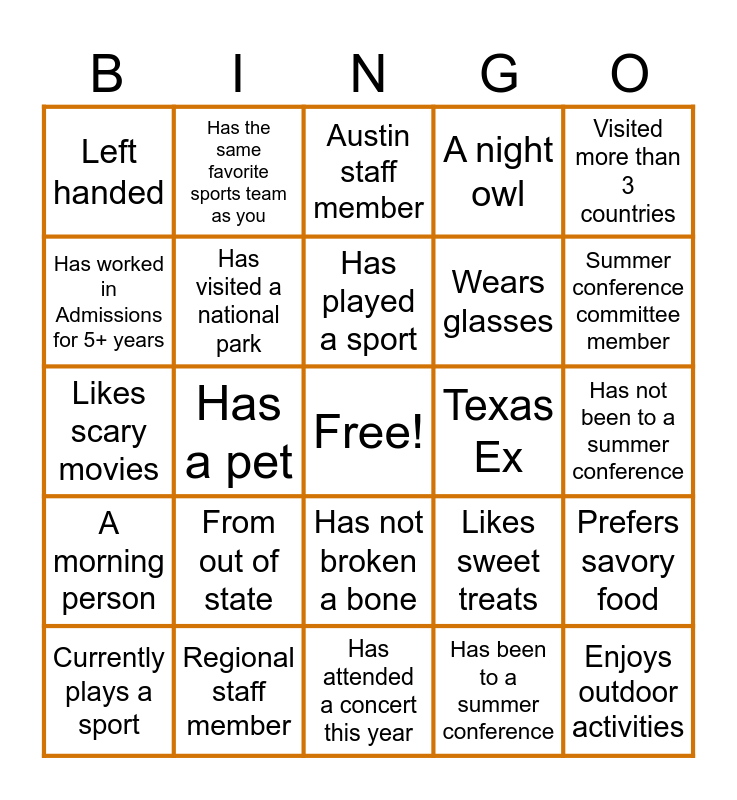 This bingo card has a free space and 24 words: From out of state, Regional staff member, Has played a sport, Currently plays a sport, Visited more than 3 countries, Left handed, Has worked in Admissions for 5+ years, Has the same favorite sports team as you, Texas Ex, Has not broken a bone, Wears glasses, Likes scary movies, Likes sweet treats, Prefers savory food, Has visited a national park, Has been to a summer conference, Has not been to a summer conference, Austin staff member, Summer conference committee member, Has a pet, Enjoys outdoor activities, A morning person, A night owl and Has attended a concert this year.