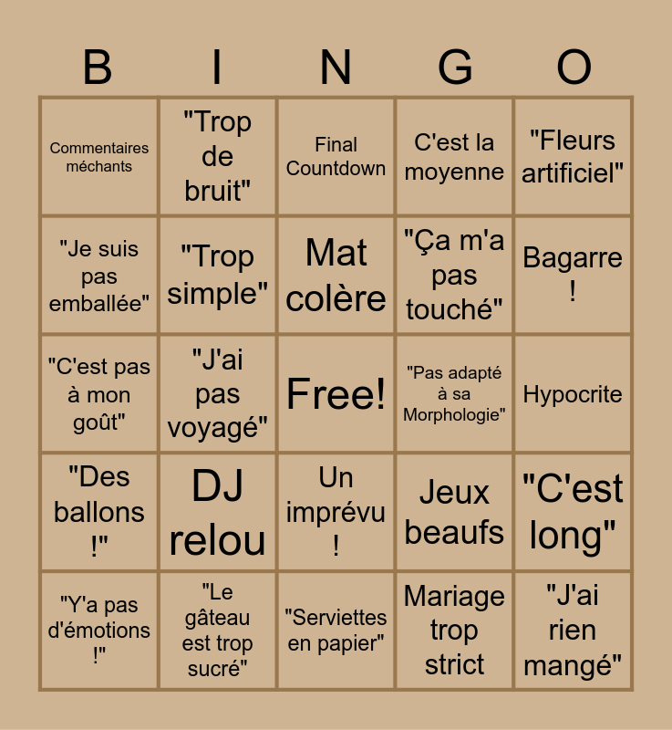 This bingo card has a free space and 33 words: "Less is more", Carton rouge + No way, "J'ai pas voyagé", Hors Thème, "Des ballons !", "Trop simple", "Fleurs artificiel", "Y'a pas d'émotions !", "Trop de bruit", 3 aigries, Mat colère, Final Countdown, Pirates des Caraïbes, "J'ai bien aimé" - 7/10, "Pas adapté à sa Morphologie", Bagarre !, "Le gâteau est trop sucré", "C'est pas à mon goût", DJ relou, Jeux beaufs, Un imprévu !, Robe mal ajustée, Commentaires méchants, Hypocrite, "Serviettes en papier", "J'ai rien mangé", C'est la moyenne, "Ça m'a pas touché", "Je suis pas emballée", "C'est long", "C'est pas mon style de musique", Mariage trop strict and Déco trop chargée.