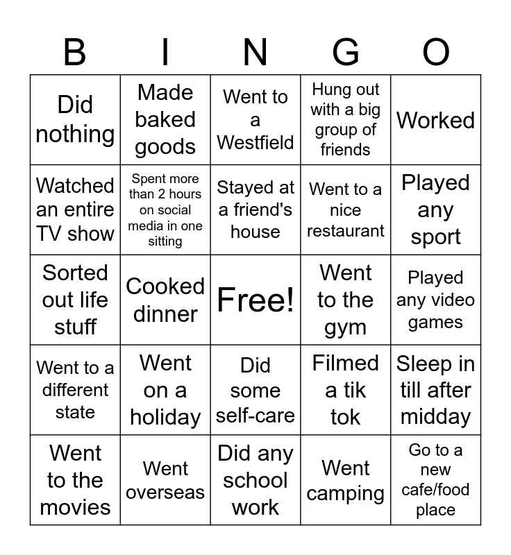 This bingo card has a free space and 24 words: Went on a holiday, Went overseas, Stayed at a friend's house, Went to the movies, Worked, Did nothing, Watched an entire TV show, Made baked goods, Went to the gym, Did some self-care, Went to a nice restaurant, Sorted out life stuff, Filmed a tik tok, Sleep in till after midday, Spent more than 2 hours on social media in one sitting, Went camping, Played any video games, Went to a Westfield, Played any sport, Cooked dinner, Go to a new cafe/food place, Went to a different state, Hung out with a big group of friends and Did any school work.