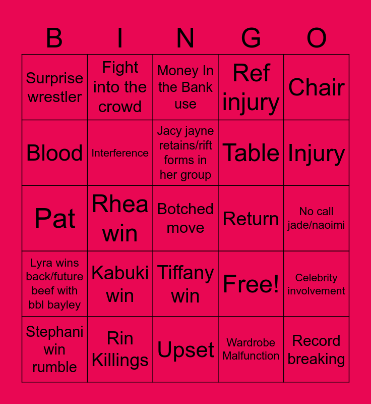 This bingo card has 25 words: Kabuki win, Upset, Jacy jayne retains/rift forms in her group, Stephani win rumble, Chair, Surprise wrestler, Blood, Fight into the crowd, Return, Tiffany win, Table, Pat, Free!, Celebrity involvement, Interference, Record breaking, No call jade/naoimi, Money In the Bank use, Injury, Rhea win, Botched move, Rin Killings, Lyra wins back/future beef with bbl bayley, Ref injury and Wardrobe Malfunction.