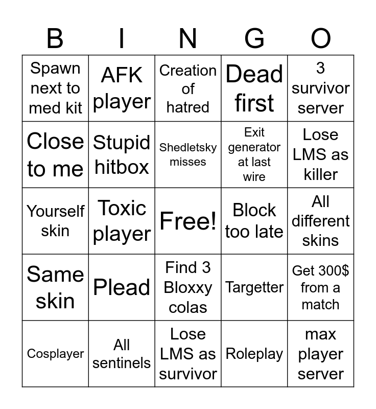 This bingo card has a free space and 24 words: Plead, All sentinels, Shedletsky misses, Cosplayer, 3 survivor server, Spawn next to med kit, Close to me, AFK player, Block too late, Find 3 Bloxxy colas, Exit generator at last wire, Yourself skin, Targetter, Get 300$ from a match, Stupid hitbox, Roleplay, All different skins, Creation of hatred, Lose LMS as killer, Toxic player, max player server, Same skin, Dead first and Lose LMS as survivor.