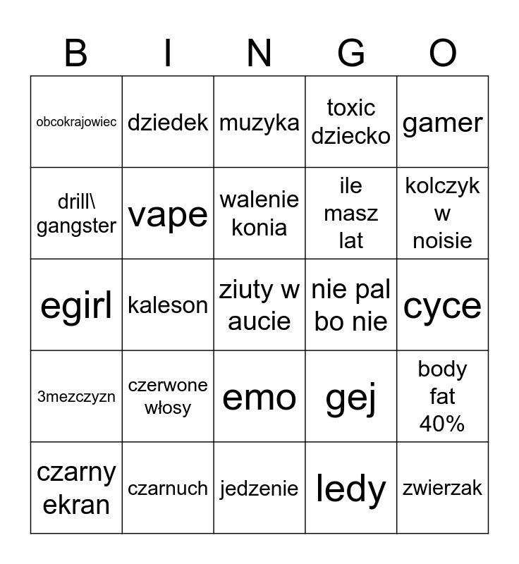 This bingo card has 25 words: czerwone włosy, jedzenie, walenie konia, czarny ekran, gamer, obcokrajowiec, drill\ gangster, dziedek, nie pal bo nie, emo, ile masz lat, egirl, gej, body fat 40%, vape, zwierzak, cyce, muzyka, kolczyk w noisie, kaleson, ziuty w aucie, czarnuch, 3mezczyzn, toxic dziecko and ledy.