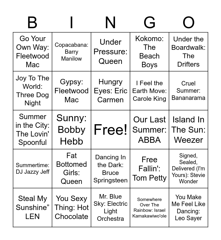 This bingo card has a free space and 50 words: Crocodile Rock: Elton John, You Make Me Feel Like Dancing: Leo Sayer, Barracuda: Heart, Mr. Blue Sky: Electric Light Orchestra, Fat Bottomed Girls: Queen, Summer Nights: John Travolta, Copacabana: Barry Manilow, Night Fever: Bee Gees, Joy To The World: Three Dog Night, Lovely Day: Bill Withers, Gypsy: Fleetwood Mac, Kokomo: The Beach Boys, Signed, Sealed, Delivered (I'm Yours): Stevie Wonder, Free Fallin': Tom Petty, Good Vibrations: The Beach Boys, Sundown: Gordon Lightfoot, Hungry Eyes: Eric Carmen, Our Last Summer: ABBA, Sunshine Of Your Love: Cream, Under the Boardwalk: The Drifters, Sunny: Bobby Hebb, Somewhere Over The Rainbow: Israel Kamakawiwo'ole, Go Your Own Way: Fleetwood Mac, I Feel the Earth Move: Carole King, (Don't Fear) The Reaper: Blue Oyster Cult, The Boys Are Back In Town: Thin Lizzy, Cruel Summer: Bananarama, All Night Long: Lionel Richie, Under Pressure: Queen, Dancing In the Dark: Bruce Springsteen, I'm Coming Out: Diana Ross, Pour Some Sugar On Me: Def Leppard, Our House: Madness, Stuck In The Middle With You: Stealers Wheel, You Sexy Thing: Hot Chocolate, You Make My Dreams (Come True): Daryl Hall & John Oates, In The Summertime: Shaggy, Summer Breeze: Seals and Crofts, Walkin' On The Sun: Smash Mouth, Island In The Sun: Weezer, Surfin' USA: The Beach Boys, The Boys Of Summer: Don Henley, The Tide Is High: Blondie, Summer Of '69: Bryan Adams, Steal My Sunshine” LEN, Summer in the City: The Lovin' Spoonful, Riptide: Vance Joy, Here Comes The Sun: The Beatles, Summertime: DJ Jazzy Jeff and Hotel California: Eagles.