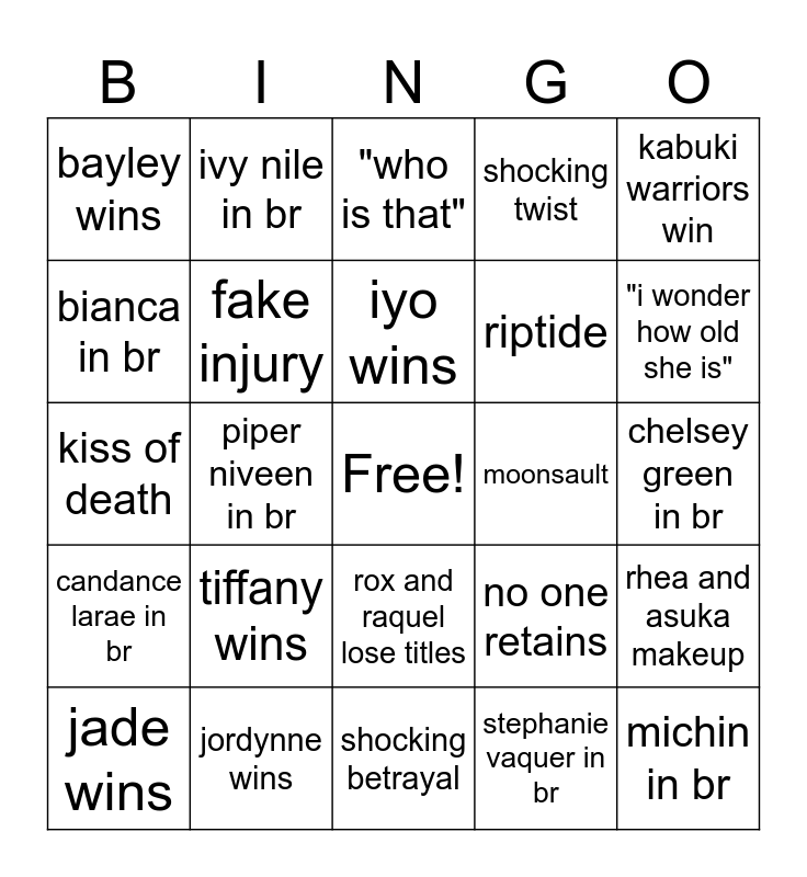 This bingo card has a free space and 24 words: tiffany wins, jordynne wins, iyo wins, jade wins, kabuki warriors win, bayley wins, bianca in br, ivy nile in br, moonsault, rox and raquel lose titles, riptide, kiss of death, no one retains, rhea and asuka makeup, fake injury, stephanie vaquer in br, chelsey green in br, "who is that", "i wonder how old she is", piper niveen in br, michin in br, candance larae in br, shocking twist and shocking betrayal.