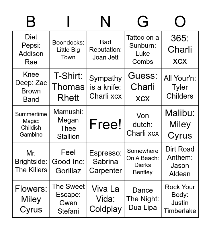 This bingo card has a free space and 50 words: Dani California: Red Hot Chili Peppers, Rock Your Body: Justin Timberlake, I Kissed A Girl: Katy Perry, Viva La Vida: Coldplay, Feel Good Inc: Gorillaz, Summertime: Kenny Chesney, Boondocks: Little Big Town, My Humps: Black Eyed Peas, Knee Deep: Zac Brown Band, American Kids: Kenny Chesney, T-Shirt: Thomas Rhett, Tattoo on a Sunburn: Luke Combs, Dirt Road Anthem: Jason Aldean, Somewhere On A Beach: Dierks Bentley, 7 Summers: Morgan Wallen, Sun Daze: Florida Georgia Line, Sympathy is a knife: Charli xcx, Von dutch: Charli xcx, Formation: Beyonce, 365: Charli xcx, Mamushi: Megan Thee Stallion, Dance The Night: Dua Lipa, Diet Pepsi: Addison Rae, Guess: Charli xcx, Apple: Charli xcx, Girls In Bikinis: Poppy, All Your'n: Tyler Childers, HOT TO GO!: Chappell Roan, Bad Reputation: Joan Jett, Espresso: Sabrina Carpenter, Boom Clap: Charli xcx, Super Bass: Nicki Minaj, Bang Bang: Jessie J, Body: Megan Thee Stallion, The Sweet Escape: Gwen Stefani, The Spins: Madness, Shut Up And Drive: Rihanna, California Gurls: Katy Perry, Pocketful of Sunshine: Natasha Bedingfield, Malibu: Miley Cyrus, Summer Girls: LFO, Summertime Sadness: Lana Del Rey, Starships: Nicki Minaj, Cool Kids: Echosmith, Flowers: Miley Cyrus, Summertime Magic: Childish Gambino, Feels Like Summer: Childish Gambino, Electric Feel: MGMT, Mr. Brightside: The Killers and Maneater: Nelly Furtado.