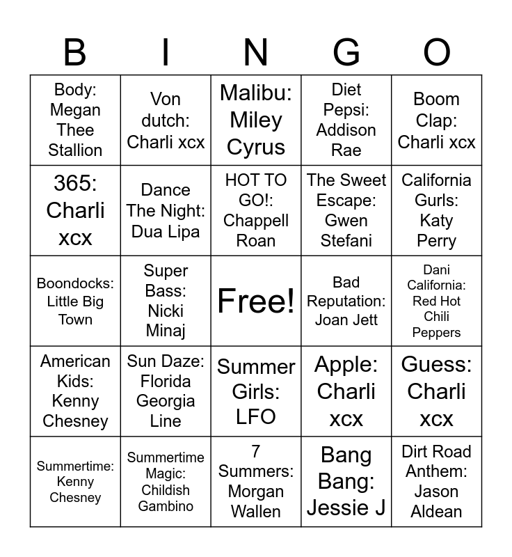 This bingo card has a free space and 50 words: Tattoo on a Sunburn: Luke Combs, Dirt Road Anthem: Jason Aldean, Somewhere On A Beach: Dierks Bentley, 7 Summers: Morgan Wallen, Sun Daze: Florida Georgia Line, Sympathy is a knife: Charli xcx, Von dutch: Charli xcx, Formation: Beyonce, 365: Charli xcx, Mamushi: Megan Thee Stallion, Dance The Night: Dua Lipa, Diet Pepsi: Addison Rae, Guess: Charli xcx, Apple: Charli xcx, Girls In Bikinis: Poppy, All Your'n: Tyler Childers, HOT TO GO!: Chappell Roan, Bad Reputation: Joan Jett, Espresso: Sabrina Carpenter, Boom Clap: Charli xcx, Super Bass: Nicki Minaj, Bang Bang: Jessie J, Body: Megan Thee Stallion, The Sweet Escape: Gwen Stefani, The Spins: Madness, Shut Up And Drive: Rihanna, California Gurls: Katy Perry, Pocketful of Sunshine: Natasha Bedingfield, Malibu: Miley Cyrus, Summer Girls: LFO, Summertime Sadness: Lana Del Rey, Starships: Nicki Minaj, Cool Kids: Echosmith, Flowers: Miley Cyrus, Summertime Magic: Childish Gambino, Feels Like Summer: Childish Gambino, Electric Feel: MGMT, Mr. Brightside: The Killers, Maneater: Nelly Furtado, Dani California: Red Hot Chili Peppers, Rock Your Body: Justin Timberlake, I Kissed A Girl: Katy Perry, Viva La Vida: Coldplay, Feel Good Inc: Gorillaz, Summertime: Kenny Chesney, Boondocks: Little Big Town, My Humps: Black Eyed Peas, Knee Deep: Zac Brown Band, American Kids: Kenny Chesney and T-Shirt: Thomas Rhett.