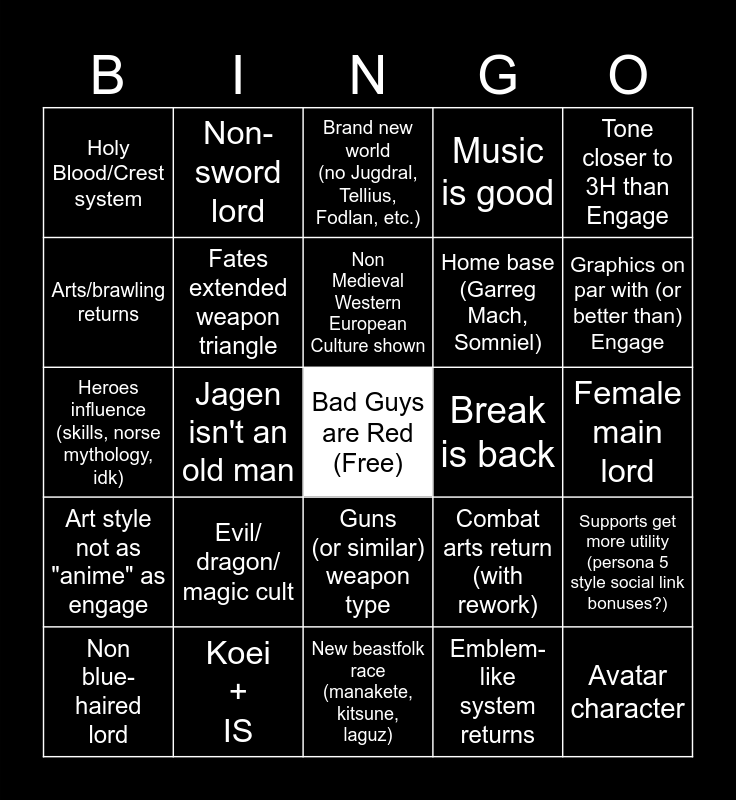 This bingo card has a free space and 24 words: Non blue-haired lord, Evil/ dragon/ magic cult, Non Medieval Western European Culture shown, Emblem-like system returns, Tone closer to 3H than Engage, Holy Blood/Crest system, Non-sword lord, Brand new world (no Jugdral, Tellius, Fodlan, etc.), Break is back, Female main lord, Heroes influence (skills, norse mythology, idk), Fates extended weapon triangle, Combat arts return (with rework), Supports get more utility (persona 5 style social link bonuses?), Arts/brawling returns, Koei + IS, New beastfolk race (manakete, kitsune, laguz), Music is good, Graphics on par with (or better than) Engage, Art style not as "anime" as engage, Jagen isn't an old man, Guns (or similar) weapon type, Home base (Garreg Mach, Somniel) and Avatar character.