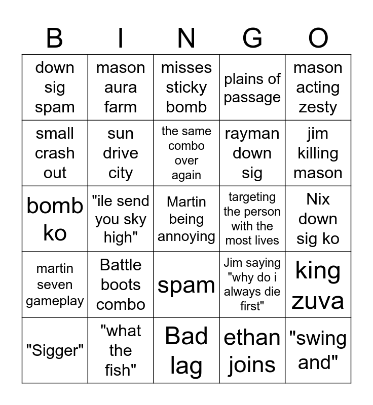 This bingo card has a free space and 24 words: Battle boots combo, "what the fish", the same combo over again, "Sigger", mason acting zesty, down sig spam, small crash out, mason aura farm, targeting the person with the most lives, spam, rayman down sig, bomb ko, Jim saying "why do i always die first", king zuva, sun drive city, ethan joins, Nix down sig ko, misses sticky bomb, jim killing mason, "ile send you sky high", "swing and", martin seven gameplay, plains of passage and Bad lag.