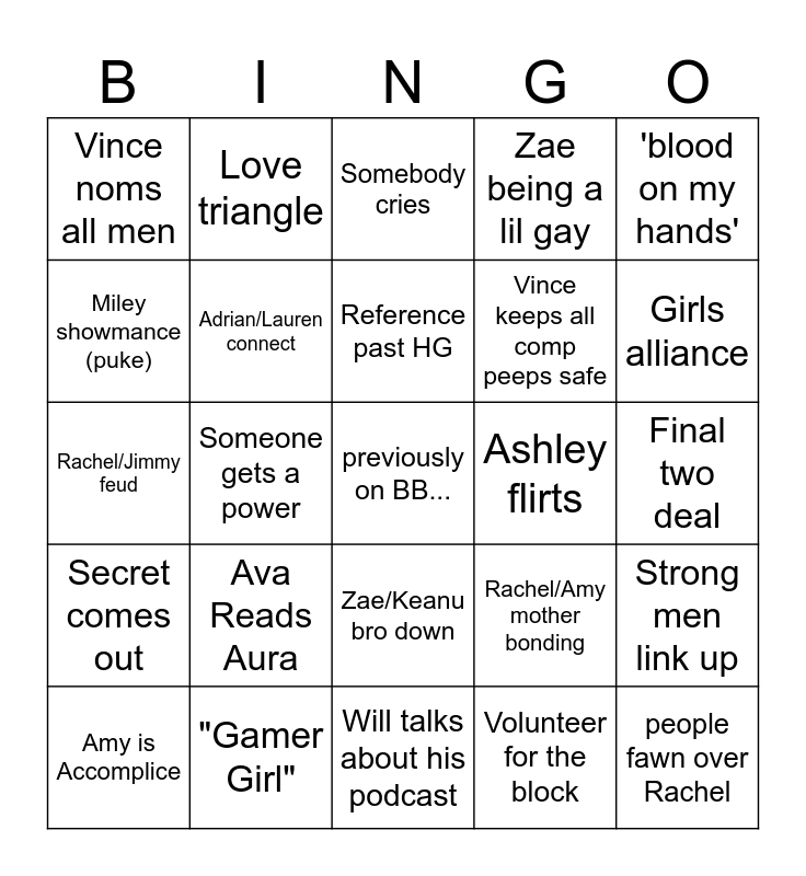 This bingo card has a free space and 24 words: Ava Reads Aura, "Gamer Girl", Reference past HG, Amy is Accomplice, 'blood on my hands', Vince noms all men, Miley showmance (puke), Love triangle, Ashley flirts, Zae/Keanu bro down, Vince keeps all comp peeps safe, Rachel/Jimmy feud, Rachel/Amy mother bonding, Strong men link up, Adrian/Lauren connect, Volunteer for the block, Final two deal, Somebody cries, Girls alliance, Someone gets a power, people fawn over Rachel, Secret comes out, Zae being a lil gay and Will talks about his podcast.