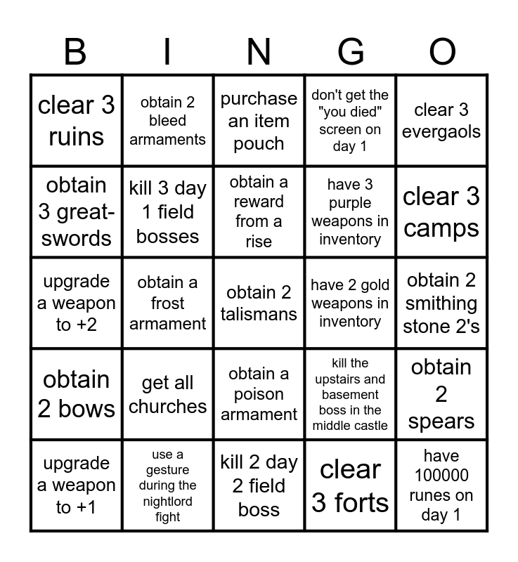 This bingo card has 25 words: get all churches, kill 2 day 2 field boss, obtain a reward from a rise, upgrade a weapon to +1, clear 3 evergaols, clear 3 ruins, obtain 3 great-swords, obtain 2 bleed armaments, have 2 gold weapons in inventory, obtain a poison armament, have 3 purple weapons in inventory, upgrade a weapon to +2, kill the upstairs and basement boss in the middle castle, obtain 2 spears, kill 3 day 1 field bosses, have 100000 runes on day 1, obtain 2 smithing stone 2's, purchase an item pouch, clear 3 camps, obtain a frost armament, obtain 2 talismans, use a gesture during the nightlord fight, obtain 2 bows, don't get the "you died" screen on day 1 and clear 3 forts.