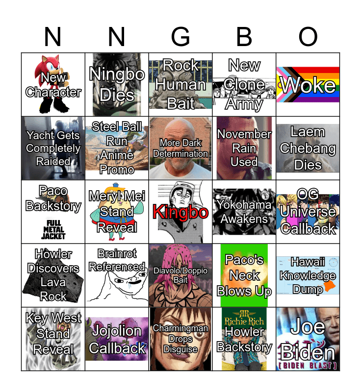This bingo card has 34 images, a free space and 34 words: VC Jojo Lore, Usagi Actually Hits His Target, Howler Stand, Usagi Backstory, OG Universe Callback, Yacht Gets Completely Raided, Steel Ball Run Anime Promo, Charmingman Drops Disguise, November Rain Used, Joe Biden, Paco Backstory, Ningbo Dies, Howler Backstory, Howler Escapes, Howler Discovers Lava Rock, Meryl Mei Stand Reveal, Diavolo/Doppio Bait, Yokohama Awakens, Hawaii Knowledge Dump, Key West Stand Reveal, Jojolion Callback, Lulu Betrays Gang, New Clone Army, Laem Chebang Dies, Ningbo Survives, Brainrot Referenced, Rock Human Bait, Even Gorier Than Last Chapter Somehow, Woke, New Character, Barbara Ann Mention, More Dark Determination, Paco's Neck Blows Up and Haruno Higashikata.