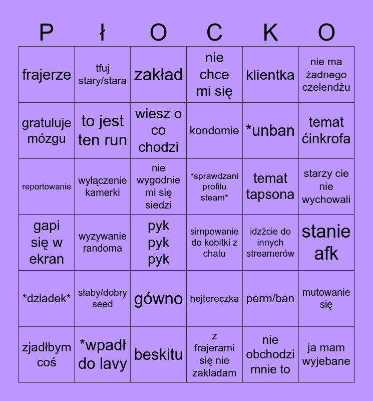 This bingo card has 36 words: hejtereczka, gówno, z frajerami się nie zakladam, gratuluje mózgu, gapi się w ekran, *sprawdzani profilu steam*, to jest ten run, beskitu, klientka, perm/ban, temat ćinkrofa, nie chce mi się, mutowanie się, wyłączenie kamerki, kondomie, frajerze, *dziadek*, temat tapsona, reportowanie, zakład, nie wygodnie mi się siedzi, wyzywanie randoma, simpowanie do kobitki z chatu, pyk pyk pyk, idzżcie do innych streamerów, tfuj stary/stara, *unban, *wpadł do lavy, wiesz o co chodzi, nie ma żadnego czelendżu, ja mam wyjebane, zjadłbym coś, stanie afk, starzy cie nie wychowali, słaby/dobry seed and nie obchodzi mnie to.