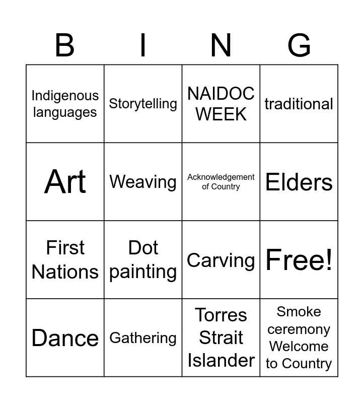 This bingo card has 20 words: Free!, Yarning, NAIDOC WEEK, Music, Dance, Art, Gathering, Indigenous languages, First Nations, Storytelling, Dot painting, Carving, Weaving, Smoke ceremony Welcome to Country, Acknowledgement of Country, Community, Elders, traditional, Torres Strait Islander and Aboriginal.