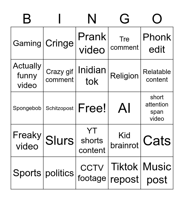 This bingo card has a free space and 24 words: Slurs, politics, Inidian tok, Sports, Phonk edit, Gaming, Actually funny video, Cringe, AI, YT shorts content, Religion, Spongebob, Kid brainrot, Cats, Crazy gif comment, Tiktok repost, short attention span video, Prank video, Relatable content, Schitzopost, Music post, Freaky video, Tre comment and CCTV footage.