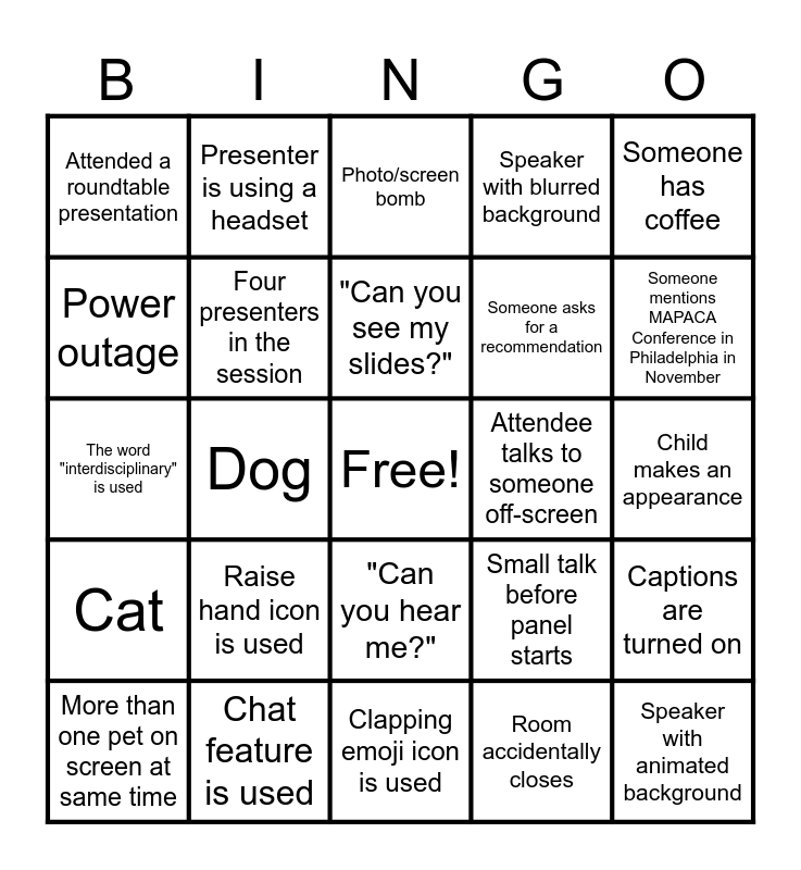 This bingo card has a free space and 40 words: "This is more a comment...", The word "interdisciplinary" is used, Presenter title involves a pun, Four presenters in the session, Chat feature is used, "Can you hear me?", "Can you see my slides?", "You're on mute!", Someone has coffee, Cat, Dog, Speaker with blurred background, Speaker with animated background, Child makes an appearance, Attendee talks to someone off-screen, Raise hand icon is used, More than 15 attendees in the session, Attended a roundtable presentation, Screen share fail, Photo/screen bomb, Captions are turned on, Room accidentally closes, Someone asks for a recommendation, Power outage, Loud background noise, The word "metatext" is used, Someone forgets to mute themselves, Someone's mic doesn't work, Someone has a pop culture related background, Delay due to tech issue, Presenter is asked more than 3 questions, More than one pet on screen at same time, Someone's screen freezes, Small talk before panel starts, Someone mentions MAPACA Conference in Philadelphia in November, Clapping emoji icon is used, Presentation is part of a larger project, Presenter mentions an article or book coming out, Presenter is using a headset and Books visible in presenter's background.