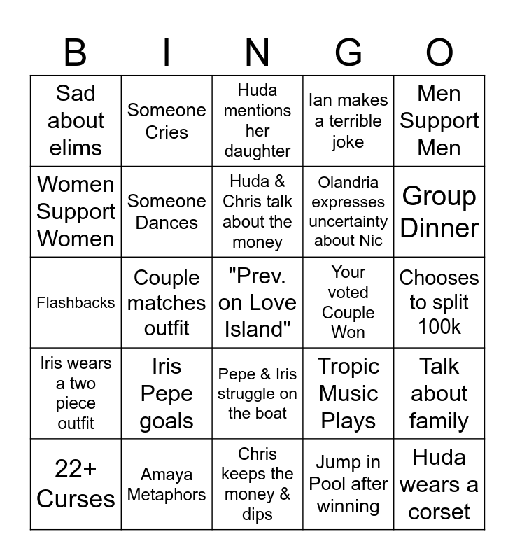This bingo card has a free space and 24 words: Iris Pepe goals, Amaya Metaphors, Huda & Chris talk about the money, 22+ Curses, Men Support Men, Sad about elims, Women Support Women, Someone Cries, Your voted Couple Won, Pepe & Iris struggle on the boat, Olandria expresses uncertainty about Nic, Flashbacks, Tropic Music Plays, Talk about family, Someone Dances, Jump in Pool after winning, Chooses to split 100k, Huda mentions her daughter, Group Dinner, Couple matches outfit, Huda wears a corset, Iris wears a two piece outfit, Ian makes a terrible joke and Chris keeps the money & dips.