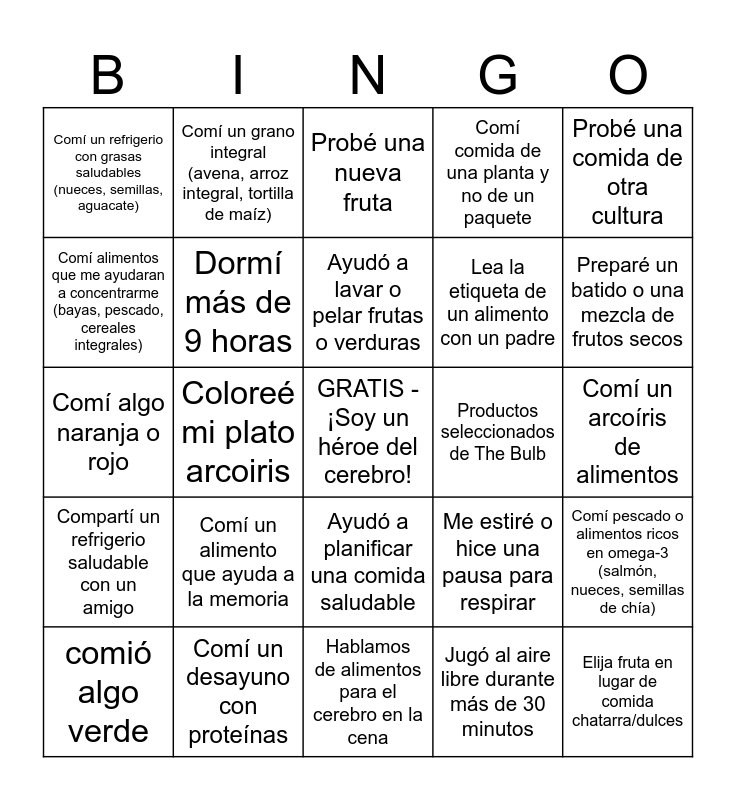 This bingo card has a free space and 29 words: comió algo verde, Bebí agua en lugar de refresco/jugo, Coloreé mi plato arcoiris, Ayudé a cocinar una verdura en casa, Comí un refrigerio con grasas saludables (nueces, semillas, aguacate), Probé una nueva fruta, Dormí más de 9 horas, Comí un alimento que ayuda a la memoria, Productos seleccionados de The Bulb, Comí un desayuno con proteínas, Comí un arcoíris de alimentos, Elija fruta en lugar de comida chatarra/dulces, Hablamos de alimentos para el cerebro en la cena, Jugó al aire libre durante más de 30 minutos, Preparé un batido o una mezcla de frutos secos, Comí frijoles, huevos o yogur, Ayudó a planificar una comida saludable, Compartí un refrigerio saludable con un amigo, Probé una comida de otra cultura, Comí algo naranja o rojo, Me estiré o hice una pausa para respirar, Comí verduras de hoja verde (espinacas, col rizada), Lea la etiqueta de un alimento con un padre, Comí alimentos que me ayudaran a concentrarme (bayas, pescado, cereales integrales), Comí comida de una planta y no de un paquete, Comí un grano integral (avena, arroz integral, tortilla de maíz), Comí pescado o alimentos ricos en omega-3 (salmón, nueces, semillas de chía), Ayudó a lavar o pelar frutas o verduras and Comimos una comida familiar juntos sin televisión ni teléfono.