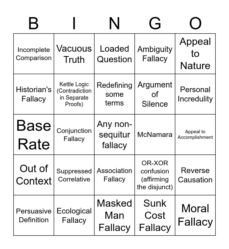 This bingo card has a free space and 104 words: Begging the Question (Circular Dependency), Appeal to Novelty, Appeal to Nature, Appeal to Authority, Appeal to Emotion, Bandwagon Fallacy, Fallacy Fallacy, Gambler's Fallacy, Ad Hominem, Tu Quoque, Appeal to Tradition, Red Herring, False Dichotomy (Black and White fallacy), Hasty Generalization (Stereotypes), Slippery Slope, Special Pleading, Loaded Question, Strawman Fallacy, Composition Fallacy, Division Fallacy, Affirming the Consequent, Anecdotal Evidence, Burden of Proof, No True Scotsman, Texas Sharpshooter, Suppressed Correlative, Personal Incredulity, Ambiguity Fallacy, Genetic Fallacy, Middle Ground Fallacy, OR-XOR confusion (affirming the disjunct), Sunk Cost Fallacy, Appeal to Ignorance, Continuum, Equivocation, Apples = Oranges (False Analogy), Denying the Antecedent, Correlation-Causation confusion, Redefining some terms, Ecological Fallacy, Etymological Fallacy, Out of Context, False Equivalence, Historian's Fallacy, Inflation of Conflict, Incomplete Comparison, Ludic Fallacy, Moral Fallacy, Nirvana Fallacy, Proof by Assertion, Cherry Picking, Psychologist's Fallacy (Subjective-Objective confusion), Reification Fallacy, Retrospective Determinism, Thought-Terminating Cliche, Fallacy of the Single Cause, Appeal to the Stone, Missed the Point, Tone Policing, Association Fallacy, Appeal to Accomplishment, Courtier's Reply, Appeal to Consequences, Bulverism, Chronological Snobbery, "It's just my own opinion" or similar, Two Wrongs makes a Right, Vacuous Truth, Base Rate, Conjunction Fallacy, Masked Man Fallacy, Moving the Goalpost, Hot Hand Fallacy (Streak Falalcy), Existential Fallacy, Motte-and-Bailey, Illicit major, Post Hoc, Persuasive Definition, Feedback Fallacy, Homunculus Fallacy, If-By-Whiskey, Loaded Label, Kettle Logic (Contradiction in Separate Proofs), Lump of Labor, McNamara, Mistaking Map for Territory (Opinion/Fact mismatch), Package Deal, Historical Fallacy, Prevalent Proof, Proving Too Much, Destroying the Exceptions, Misleading Vividness, Overwhelming Exception, Reverse Causation, Furtive Fallacy, Magical Thinking (Luck and the Supernatural), Regression Fallacy, Argument of Silence, Appeal to Motive, Ergo Decedo, Trivial Objections ("Minor spelling mistake, I win"), Relative Privation Fallacy, Quaternio Terminorum (4-Term Syllogism) and Fallacy of the Undistributed Middle.