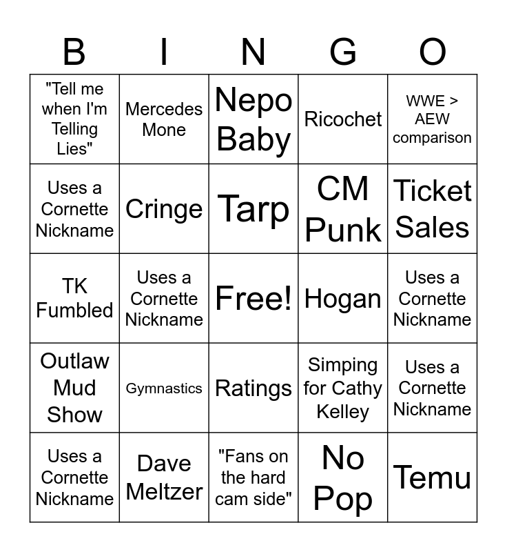 This bingo card has a free space and 24 words: Gymnastics, Dave Meltzer, Tarp, Uses a Cornette Nickname, WWE > AEW comparison, "Tell me when I'm Telling Lies", Uses a Cornette Nickname, Mercedes Mone, Hogan, Ratings, CM Punk, TK Fumbled, Simping for Cathy Kelley, Uses a Cornette Nickname, Cringe, No Pop, Uses a Cornette Nickname, Nepo Baby, Ticket Sales, Uses a Cornette Nickname, Temu, Outlaw Mud Show, Ricochet and "Fans on the hard cam side".