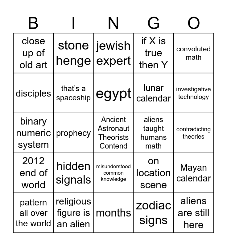 This bingo card has a free space and 24 words: hidden signals, religious figure is an alien, egypt, pattern all over the world, convoluted math, close up of old art, disciples, stone henge, aliens taught humans math, misunderstood common knowledge, lunar calendar, binary numeric system, on location scene, Mayan calendar, that’s a spaceship, zodiac signs, contradicting theories, jewish expert, investigative technology, prophecy, aliens are still here, 2012 end of world, if X is true then Y and months.