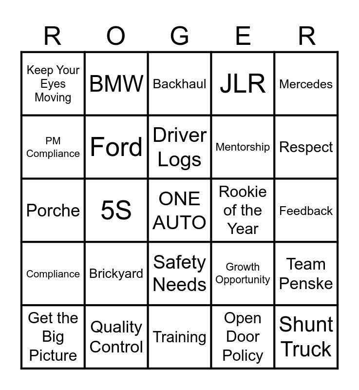 This bingo card has a free space and 75 words: Horsepower, Linehaul, Backhaul, Freight Cost, Fuel Efficiency, Load Planning, Carrier Selection, Dealer Survey, DOT Compliance, Telematics, Hours of Service, Bill of Lading, Driver Logs, PM Compliance, On-Time Delivery, 5S, Just-in-Time, Shunt Truck, Freight Management, Mercedes, Toyota, Porche, Ford, BMW, JLR, Volvo, Supply Chain Insight, Toyota Production System, Lock Box, Final Mile Delivery, Recognition, Communication, Team Huddles, Growth Opportunity, Respect, Mentorship, Inclusion, Trust, Feedback, Open Door Policy, Collaboration, Engagement Survey, Coaching, Morale Boosting, Job Satisfaction, Aim High in Steering, Get the Big Picture, Keep Your Eyes Moving, Leave Yourself an Out, Make Sure They See You, Physiological Needs, Safety Needs, Love and Belonging, Esteem Needs, Self-Actualization, Pole Position, Pace Car, Checkered Flag, Pit Stop, Victory Lane, Brickyard, Milk Tradition, Carb Day, Fastest Lap, Greatest Spectacle in Racing, Rookie of the Year, Starting Grid, Yellow Flag, Green Flag, Team Penske, Compliance, Quality Control, Service Level, Training and Innovation.