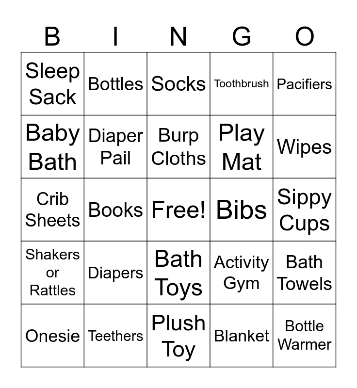 This bingo card has a free space and 24 words: Diapers, Teethers, Burp Cloths, Onesie, Pacifiers, Sleep Sack, Baby Bath, Bottles, Bibs, Bath Toys, Play Mat, Crib Sheets, Activity Gym, Bath Towels, Diaper Pail, Blanket, Sippy Cups, Socks, Wipes, Books, Bottle Warmer, Shakers or Rattles, Toothbrush and Plush Toy.